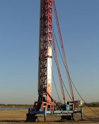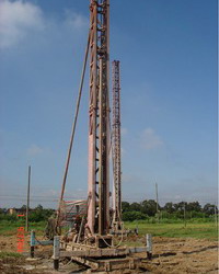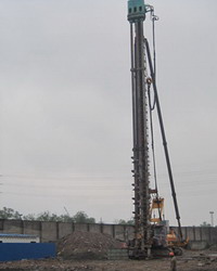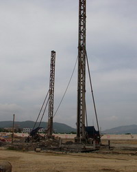 南京城建工程建設有限公司擁有一系列單頭深層水泥攪拌樁機,該深層攪拌樁鉆頭采用新型設計,鉆頭的出漿孔不易被堵塞。所述出漿孔是設在兩個下葉片之間的鉆頭體上的徑向孔,該徑向孔與鉆頭體內的縱向孔相連通。出漿孔的直徑為7-10mm。上鉆桿頂部設有與鉆桿套接的提升限位裝置,保持架上方設有經滑輪懸吊在鋼索上的驅動裝置。